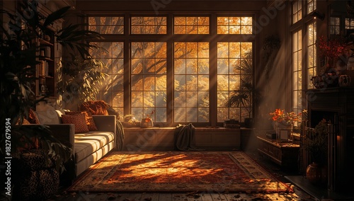 Naklejka premium Bathing living room in golden light, multi-pane window framing cushioned seat with blanket, pumpkin