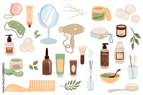 © alexdndz, Obraz premium Bathroom items mega set graphic elements in flat design. Bundle of creams, mirror, cotton buds, cosmetics, sleep mask, lotion, hair dryer, massage brush, other. Illustration isolated objects