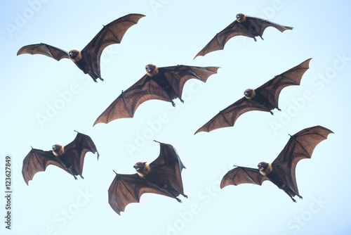 © chamnan phanthong, Fototapeta premium Bats flying on blue sky, Flying Lyle's flying fox (Pteropus lylei)
