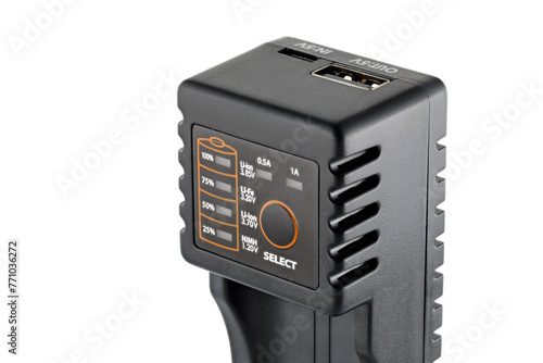Fototapeta premium Battery charger for battery type 18650 and smaller isolated on white background close-up.