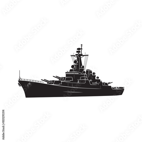 © Journey, Obraz premium Battleship silhouette vector icon. Naval warship military cruiser ship isolated on white background.
