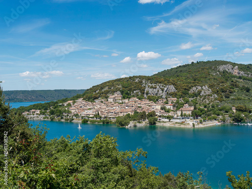 Fototapeta premium Bauduen, village touristique avec sa plage au bord du Lac de Sainte-Croix dans les Alpes de Haute Provence, au pied des gorges du Verdon et son parc régional.