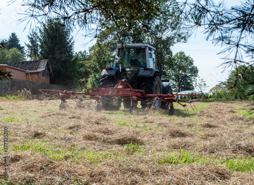 Obraz premium Bauer tut mit Traktor Heu wenden