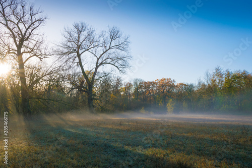 Obraz premium Baum und Nebel im Sonnenaufgang - Herbst Winter