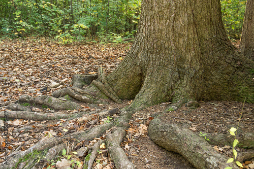 Fototapeta premium Baumwurzeln fest mit herbstlicher Erde