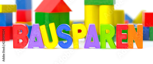 Fototapeta premium "Bausparen" - Konzept mit Holzbausteinen im Hintergrund