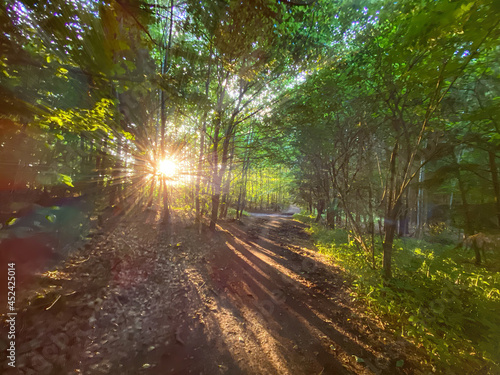 Obraz premium Bavarian Forest path with sun beams pass the trees