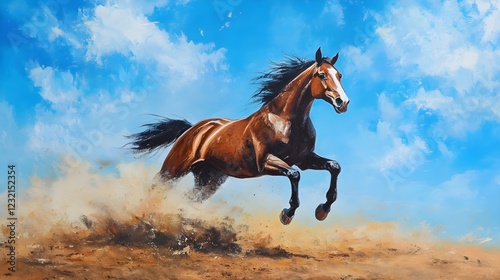 © PixelVault, Obraz premium Bay horse run gallop in dust against blue sky