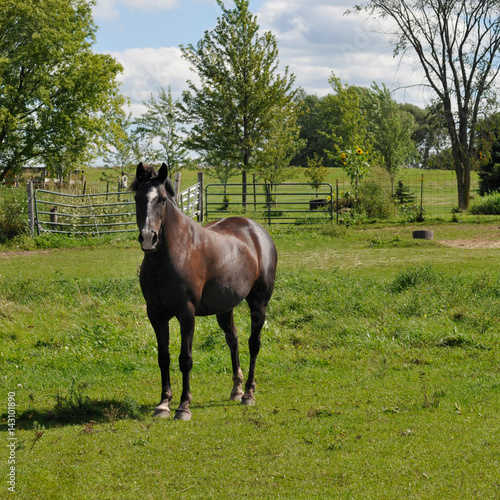 © Barbara, Fototapeta premium Bay horse standing in pasture, full view.