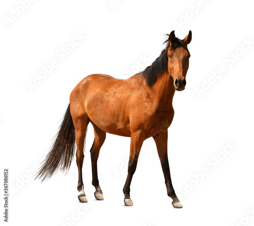 © New Africa, Naklejka premium Bay horse standing on white background. Beautiful pet