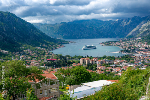 © Vitalii, Fototapeta premium Bay of Kotor from the heights. View from Mount Lovcen to the bay. View down from the observation platform on the mountain Lovcen. Mountains and bay in Montenegro. The liner near the old town of Kotor.