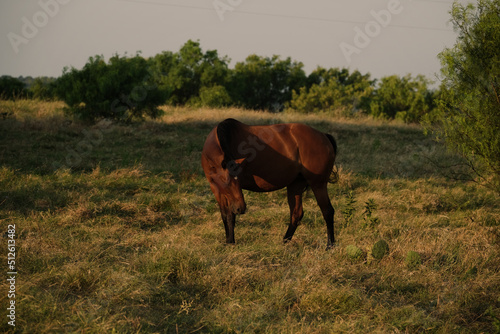 © ccestep8, Fototapeta premium Bay quarter horse in rural Texas ranch field during summer, western scene.