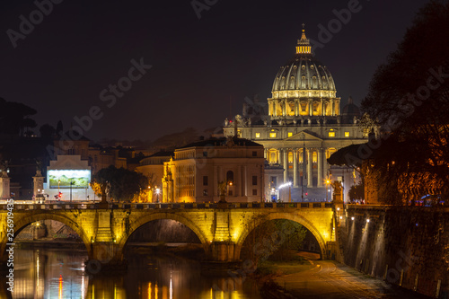© yorgil, Fototapeta premium Bazylika Świętego Piotra w nocy widok z mostu nad Tybrem
