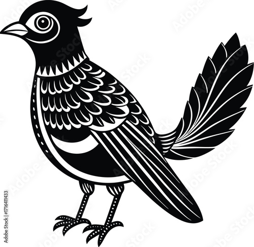 © Vector Art, Naklejka premium bBlack decorative bird with fanned tail, detailed traditional illustration.