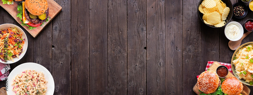 © Jenifoto, Obraz premium BBQ double border with hamburgers, classic salads and snacks. Above view table scene over a dark wood banner background. Copy space.