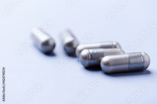 © Eugeniusz Dudziński, Naklejka premium BCAA amino acids tablets. Nutrition for bodybuilding. Fitness supplements on bright background. Soft focus. Copy space.