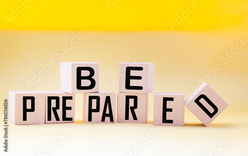 © Sviatlana, Obraz premium Be prepared words written on a wooden block with a yellow background. Conceptual symbol. Copy space.