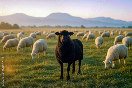 © Giada Anni, Fototapeta premium Be unique, be you: A striking black sheep stands out among a flock of white sheep grazing in a serene, sunlit pasture with mountains on the horizon.