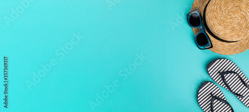 © lily_rocha, Naklejka premium Beach accessories on blue background.Summer vacation. Creative concept.Travel mood to the sea.