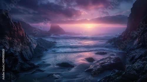 © Terablete, Fototapeta premium beach at dark foggy sunset