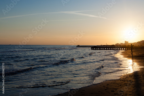Fototapeta premium Beach at dawn, piers perspective view