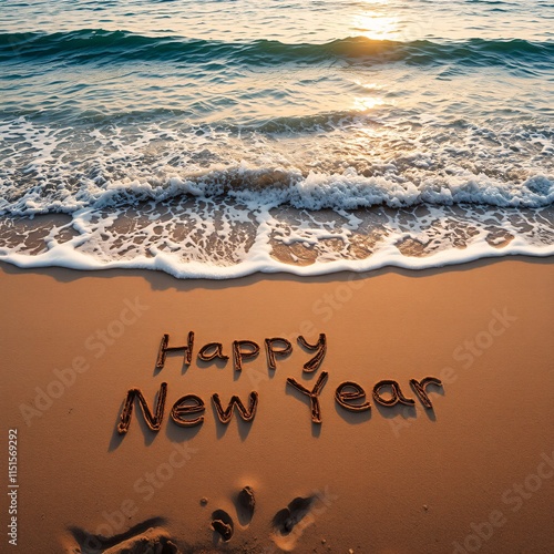 Fototapeta premium beach at sunrise, with 'Happy New Year' written in the sand