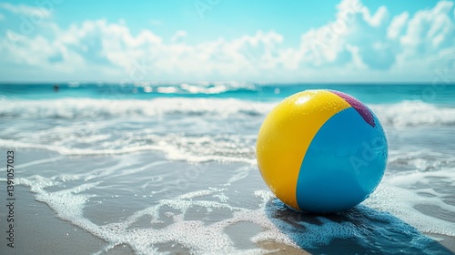 Naklejka premium Beach ball on the beach summer vacation sea ocean waves sand sunny day...