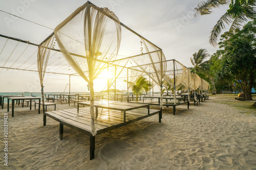 © tonaquatic, Fototapeta premium Beach bed with sunrise flare in morning time.