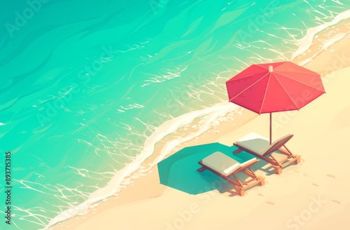© kkkiim graphic, Naklejka premium Beach Chairs and Umbrella on Sand with Blue Water Background, Top View Flat Design