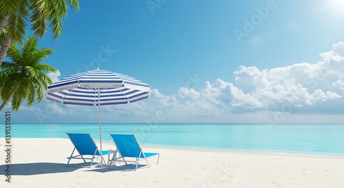 © Shah Putra, Obraz premium Beach chairs under striped umbrella