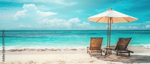 Obraz premium Beach chairs with umbrellas and beautiful tropical beach sand. AI generated images