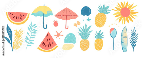 © 小源 刘, Fototapeta premium Beach Day Delights: Hand-Drawn Vector Art of Summer Elements, Ideal for Creating Trendy and Fun Visuals