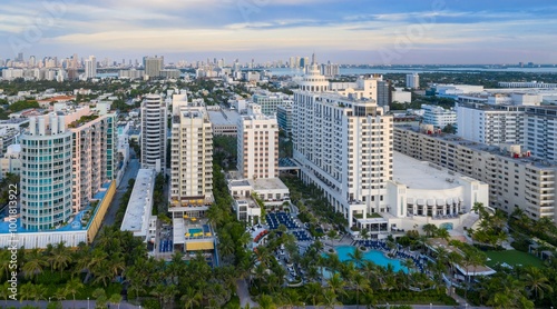 Obraz premium Beach front of art deco hotels and condos at sunrise. Miami Beach, Miami,...