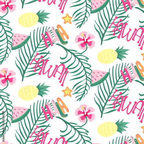 © Nataliia, Naklejka premium Beach Hawaii cheerful seamless pattern wallpaper of tropical dark green leaves of palm trees and flowers bird of paradise, plumeria on white background. For textile print, clothes, fashion