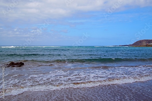 Fototapeta premium Beach in the Canary Islands. Surf waves and endless horizon. Sky and clouds.