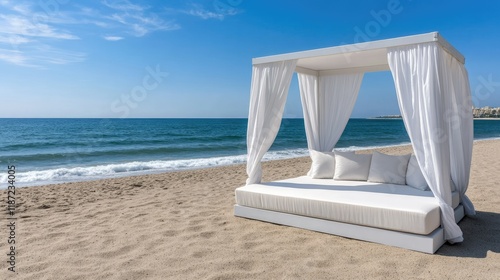 Fototapeta premium Beach lounge bed with a canopy sits invitingly on the sandy shore, surrounded...
