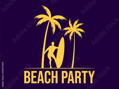 Naklejka premium Beach party poster with surfer, surfboard and palm trees. Silhouette of a...