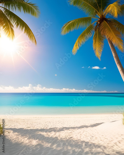 Fototapeta premium beach, sand, sea, ocean, waves, sun, sky, summer, coastal, shore, palm, surf,...