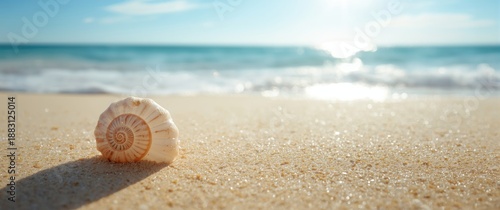 Fototapeta premium Beach Scene Featuring a Spiral Sea Shell on the Sand under a Sunny Sky,...