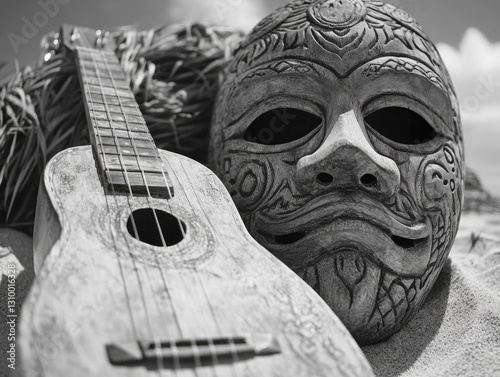 Fototapeta premium Beach scene with mask and ukulele