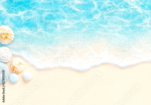 © Bonya Sharp Claw, Naklejka premium Beach scene with shells and a blue ocean. The shells are scattered on the sand, and the water is calm. Concept of relaxation and tranquility, as one can imagine the sound of the waves