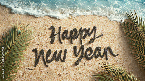 © BILAL, Fototapeta premium beach text in happy new year ai genrative