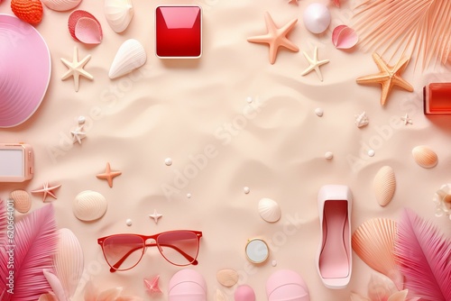 Fototapeta premium Beach themed frame with Holiday Vacation Elements with space for text - Generative AI