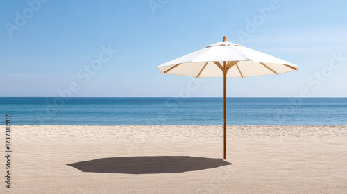 Fototapeta premium Beach umbrella casting shadow on empty sand, creating serene atmosphere by ocean