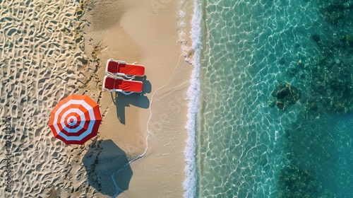 Obraz premium Beach Umbrella Loungers Sandy Shore Turquoise Water