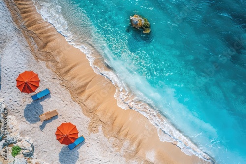 Fototapeta premium Beach umbrellas and chairs on a sandy shore. This is an aerial view of a beach perfect for summer vacation, advertising or travel blogs.