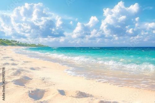 © Mariya, Obraz premium Beach Vacation Abstract Background with Calm Sea Bokeh Light and Soft Texture Sunrise Over Sandy Foreground