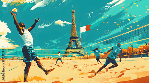 © Zape, Obraz premium Beach Volleyball: An illustration of players diving for the ball on a sandy court with the French flag flying and the Eiffel Tower in the background on a turquoise background.