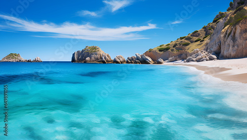 © Tanuha, Fototapeta premium Beach with yellow sand, coconut palms and turquoise water. Cala Luna beach. Sardinia, Italy.