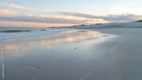 Fototapeta premium Beachscape at Dusk Highlighting Gentle Waves, Seashells in Shallows, and Subtle Shadows on Dunes - peaceful nature scene